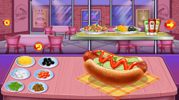 游戲分為4個部分:制作雞翅、熱狗、炸洋蔥圈和炸薯條。每個部分都有詳細的步驟,從準備原材料到切菜、加調(diào)料、攪拌等,為玩家展示如何制作這些食物。