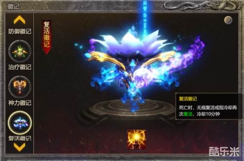【徽記】系統(tǒng)有點(diǎn)類似于其他游戲中的法寶玩法,按照增益型、直接效果型共分為7種,分別為防御徽記、治療徽記、神力徽記、復(fù)活徽記、無敵徽記、至尊徽記、邪心徽記。每個(gè)徽記都附帶了一個(gè)專屬的強(qiáng)大技能,比如上圖中所示的復(fù)活徽記,它的技能就是能令攜帶者在死亡時(shí)無視復(fù)活戒指的剩余冷卻時(shí)間、直接再次復(fù)活!