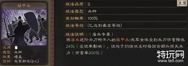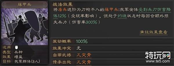 可拆戰(zhàn)法【兵種戰(zhàn)法】藤甲兵:(盾兵部隊專屬)將盾兵進階為藤甲兵,全體受到兵刃傷害降低,但處于灼燒狀態(tài)時每回合額外損失兵力。